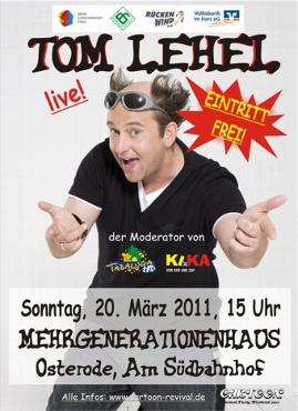 Deswegen freuen sich die Organisatoren des CARTOON-Revivals auch besonders, diesen Künstler nach Osterode bringen zu können. TOM LEHEL ist ein Garant für einen tollen Kinderspaß! Mit seinem aktuellen Programm einer Mischung aus Comedy, Tanz und Musik, möchte er den Osteroder Kindern ein Lachen auf’s Gesicht zaubern!